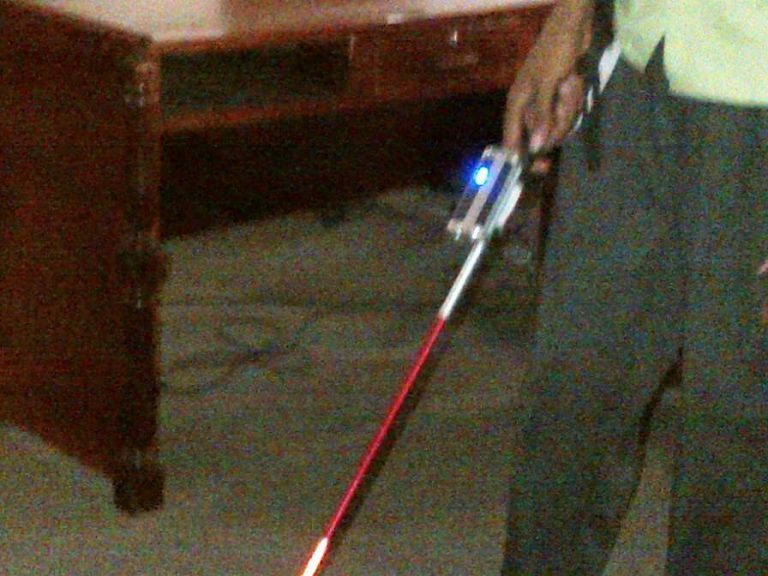 - Frank Hernández, del INCES, presentando un prototipo de bastón electrónico.